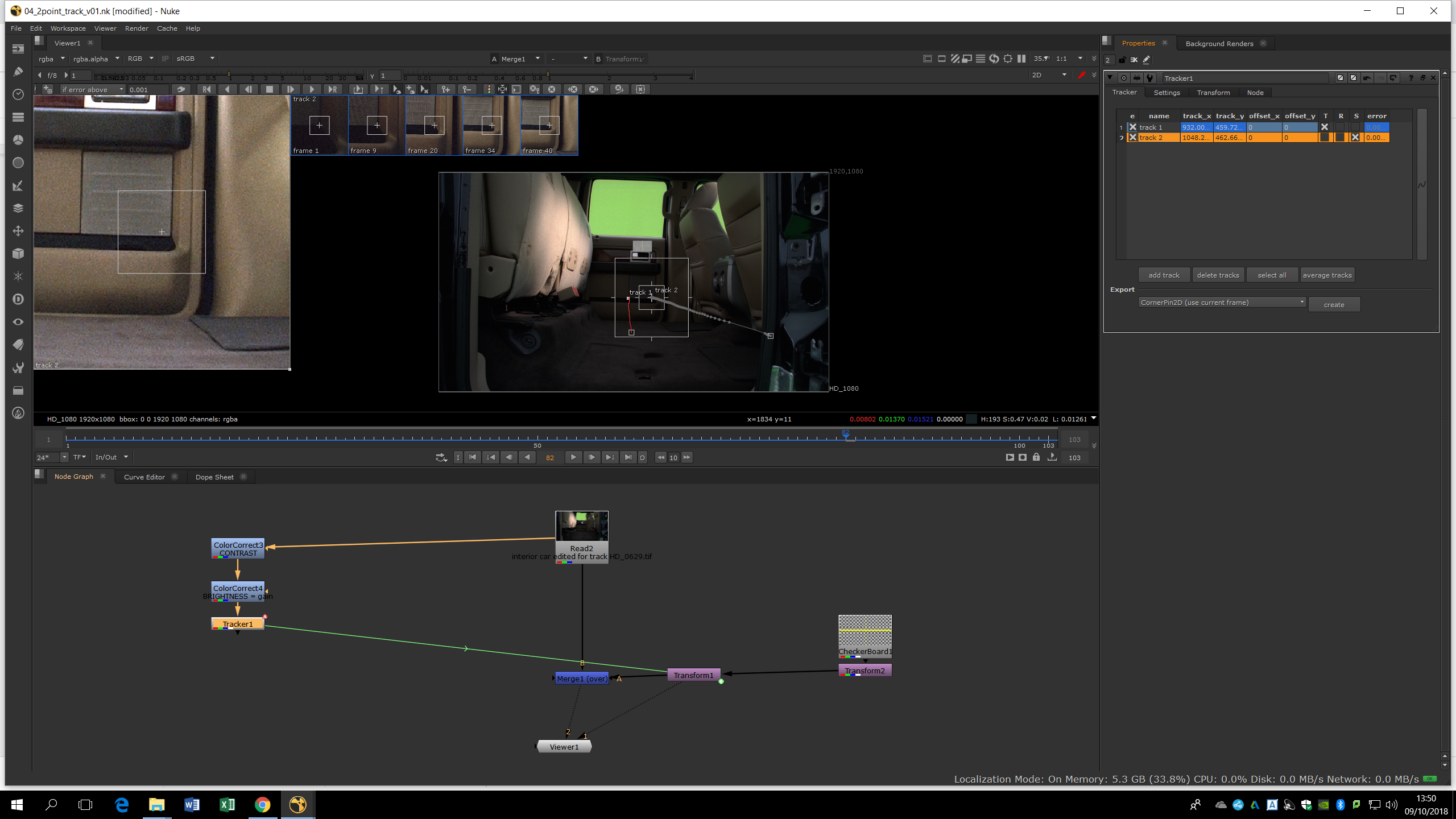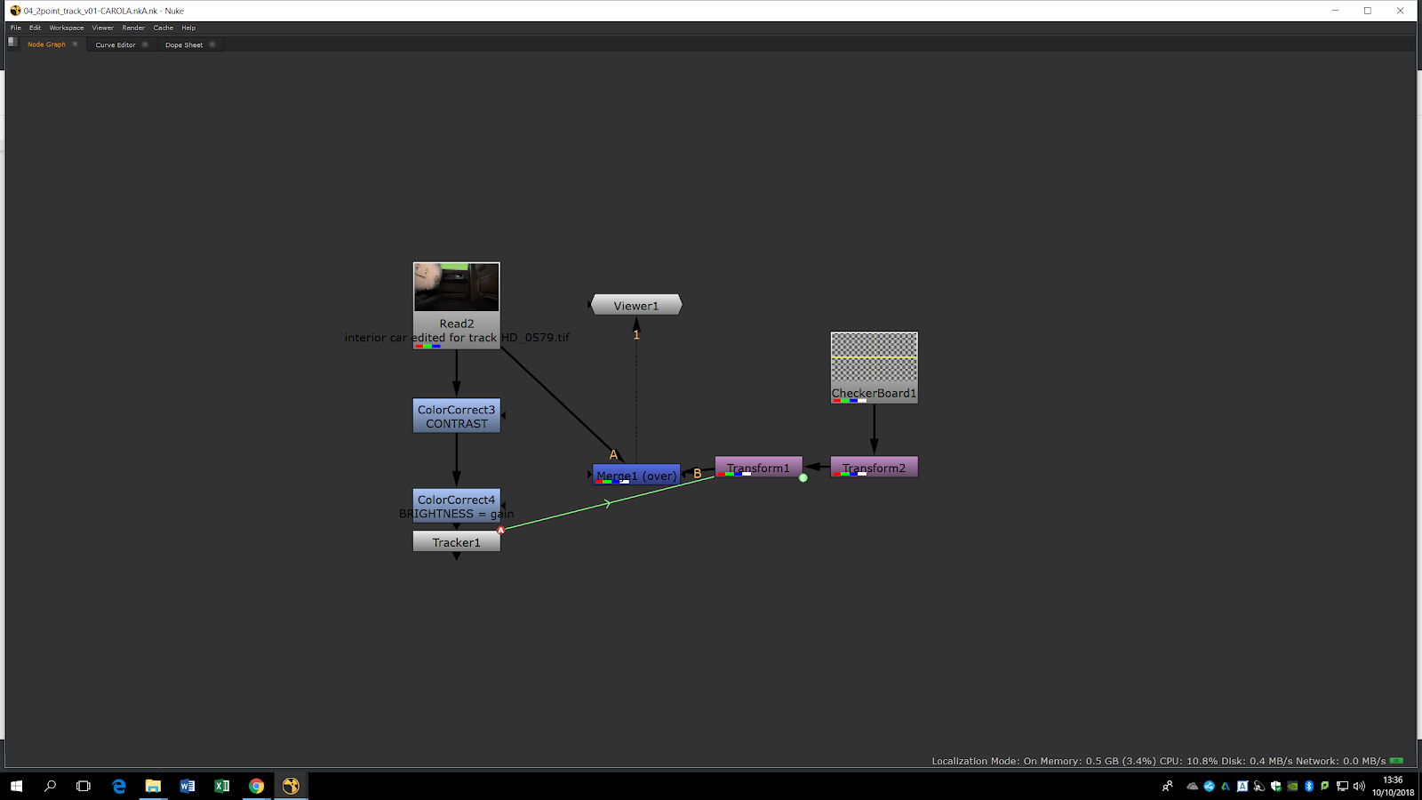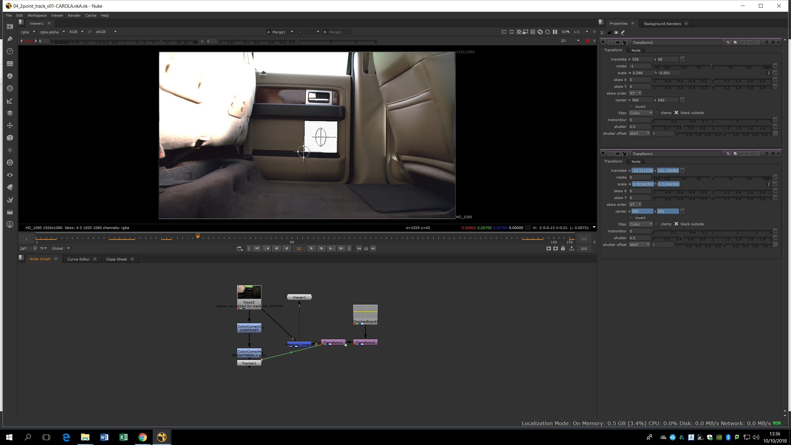 Now, we will add a Transform to the clackboard and we fit it into the square of the doot we want to track. Now, we add another transform and we link there the Translation ans Scale parameters of the tracker. If we view the merge tab, we will be able to see the clackboard moving and following the tracker transformation.