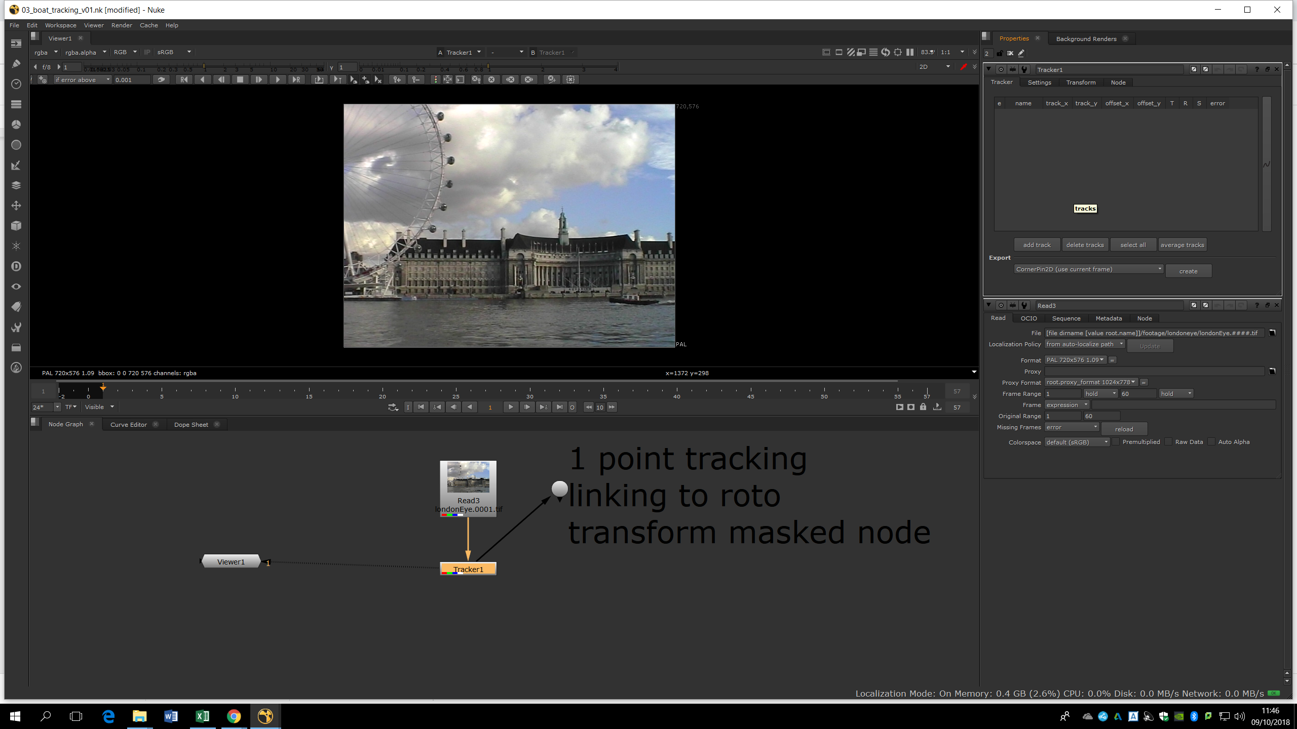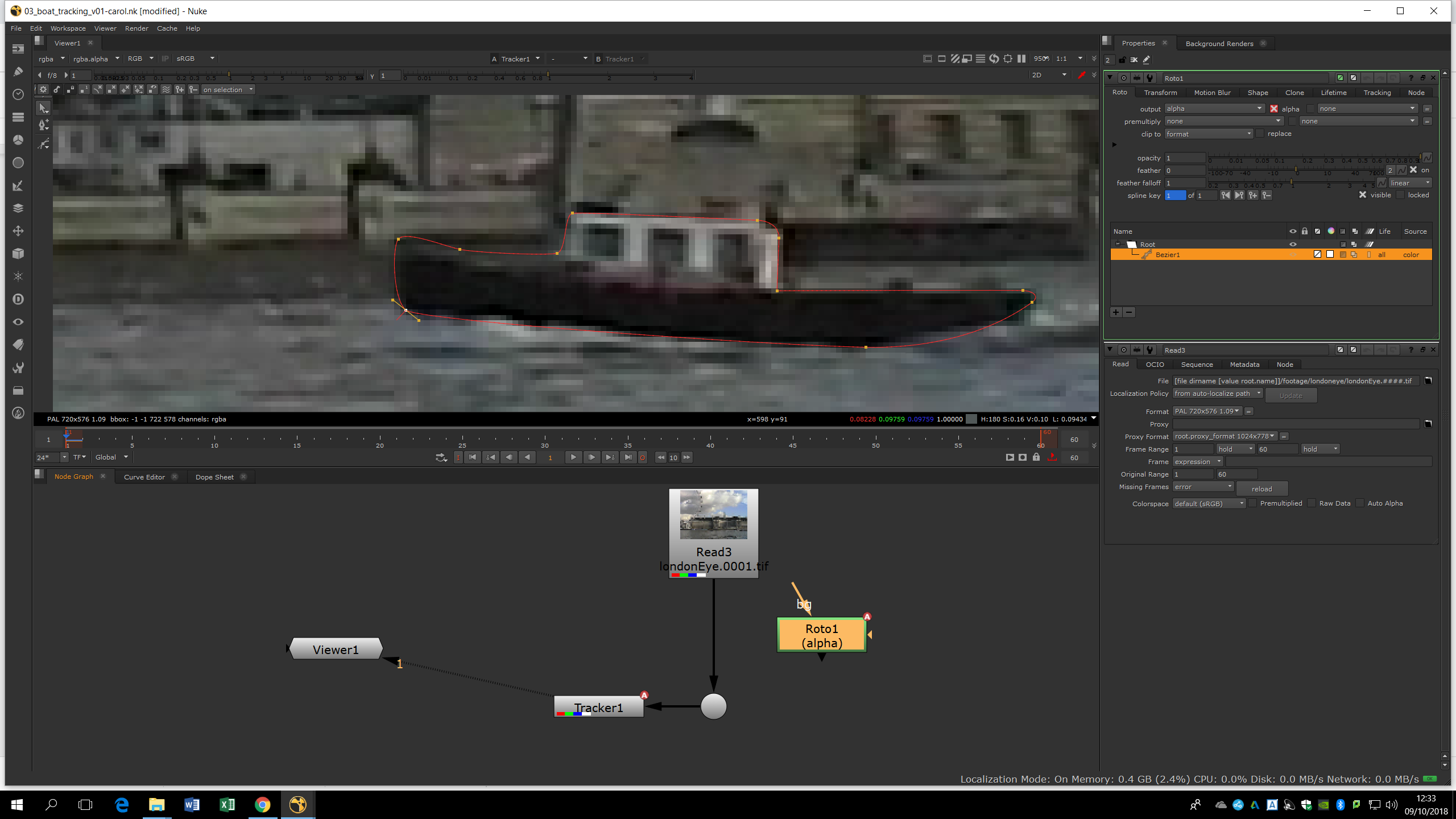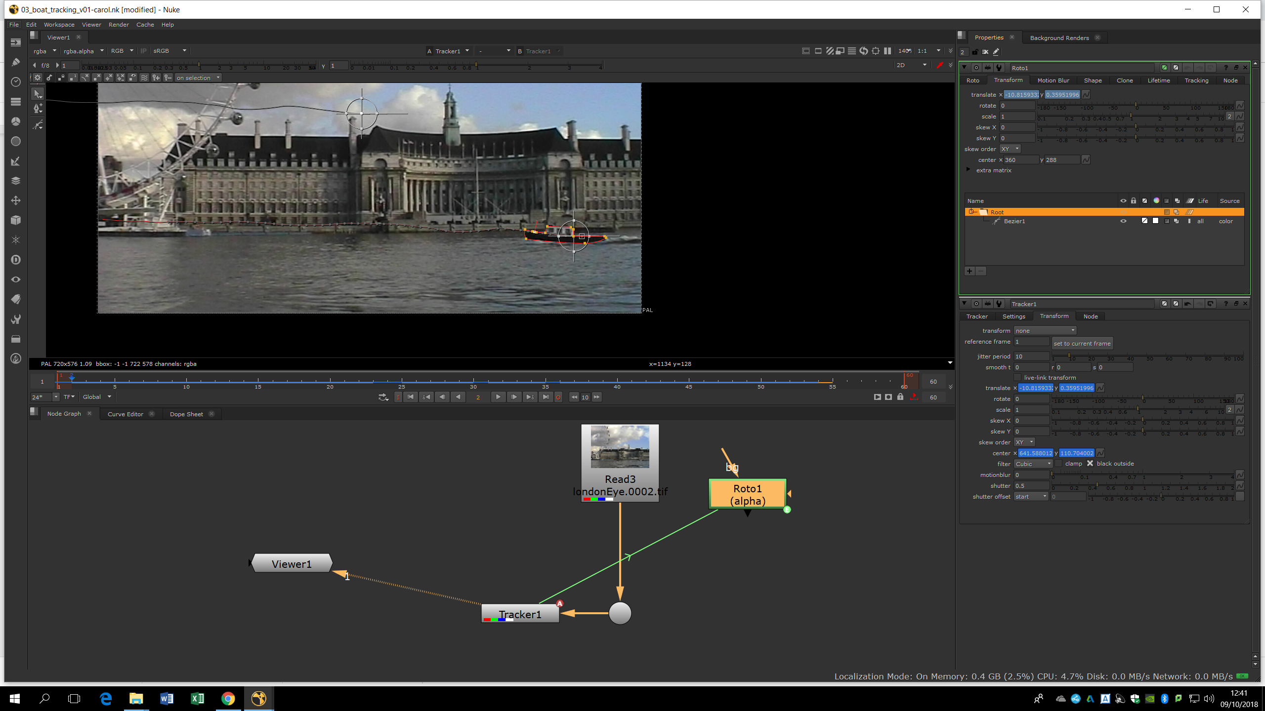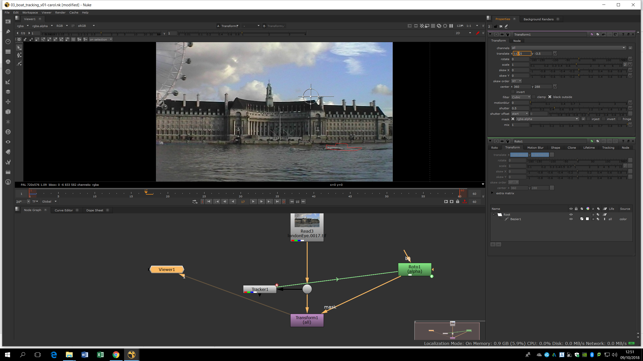 Linking tracks to rotos can make us save huge amounts of time. Now, we can add a Transform note to the footage and a mask connected to the roto. If we move the translate property of the Transform note, we can remove the boat.