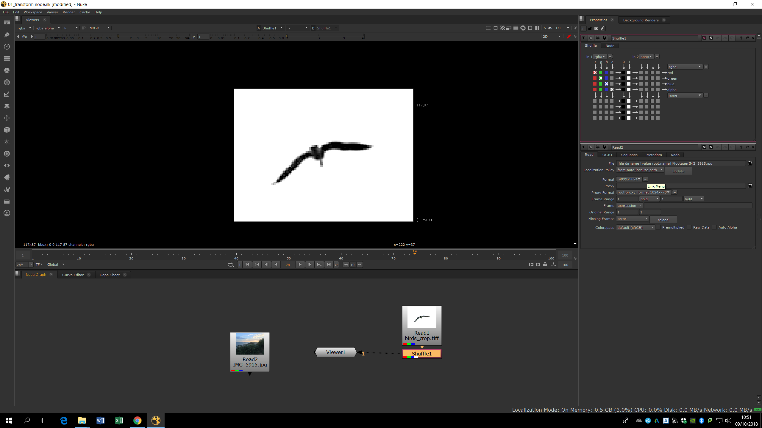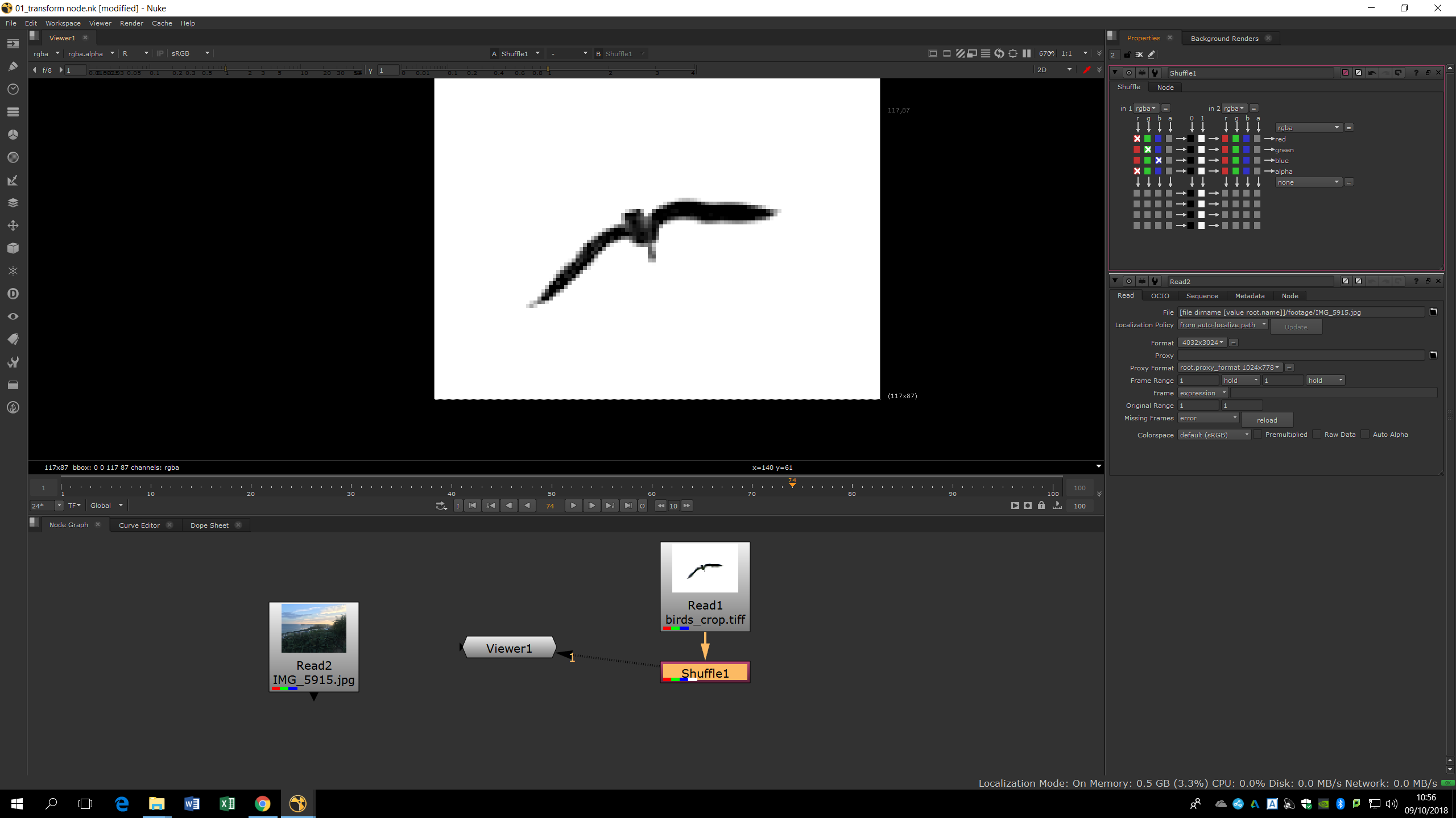We need to find the channel in which the color of the bird is closer to the black, and in this case we realized it is the red one.Therefore, it is the red channel the one we are going to turn into an alpha channel. To accomplish that, we would just need to change the alpha input on the shuttle scheme menu from alpha to red, as it is shown in the following picture. Now, if we preview the alpha channel we can see how the bird shape is marked as alpha.