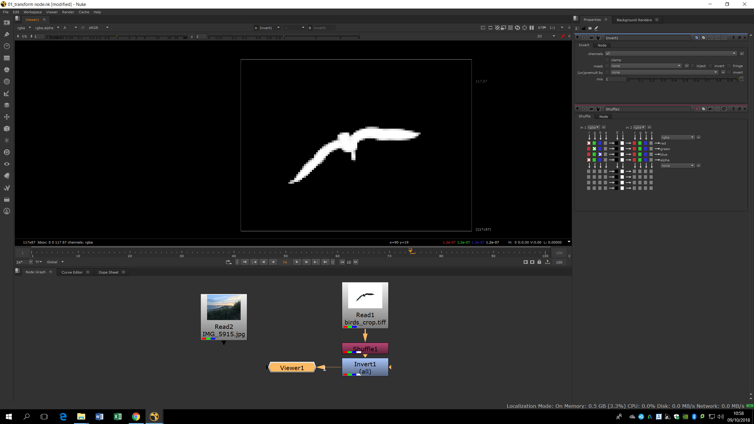 But we want the white background to be transparent, not the bird. Therefore, we should add an invert note after the shuffle. This note will also invert the RGB channels; to avoid that, we would mark in the invert settings Channels -> Alpha. Now, we can see how the bird shape is opaque and the white background became an alpha channel.