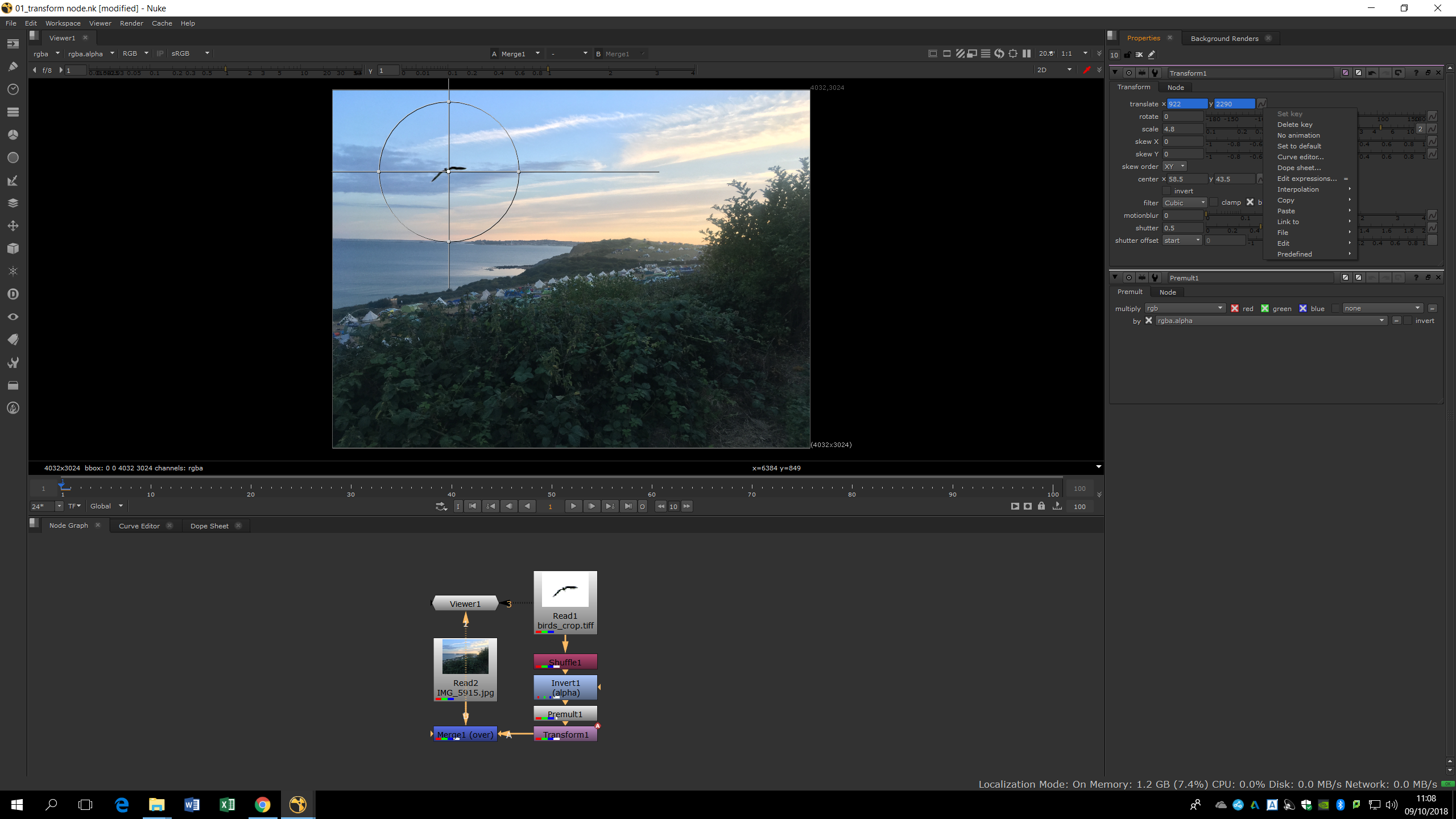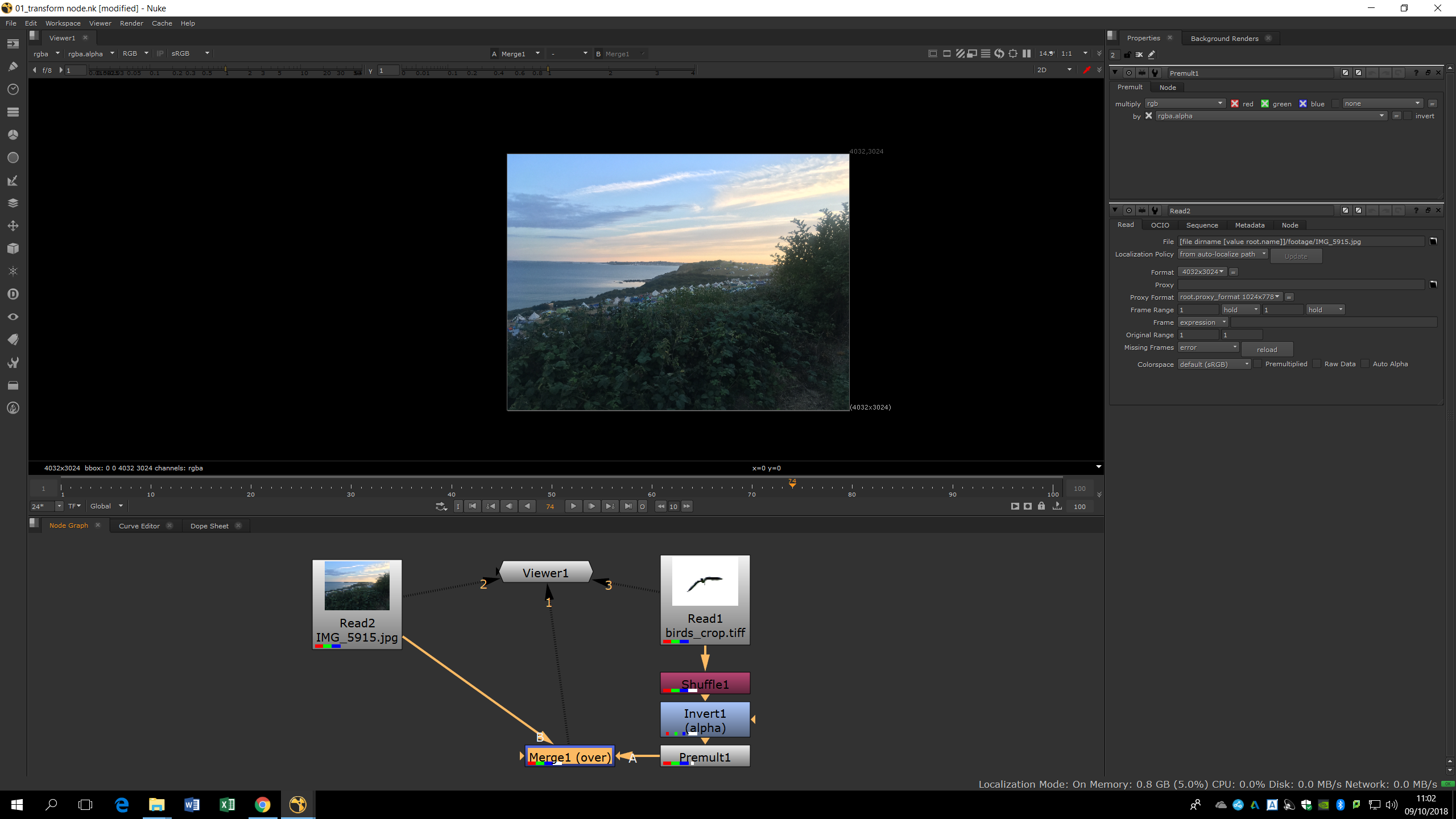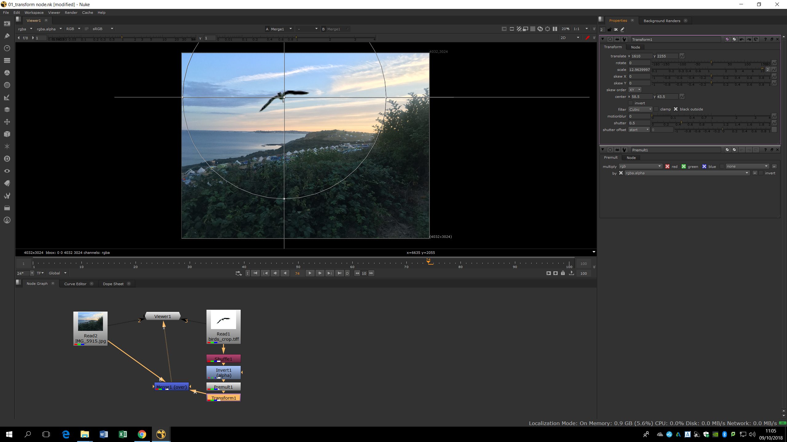 The background is much bigger than the bird, therefore we can not see it properly. To solve this problem, we just need to click in Premult note and press T in order to add a transform note and transform the bird. Now, we can scale it and place it anywhere in the background.