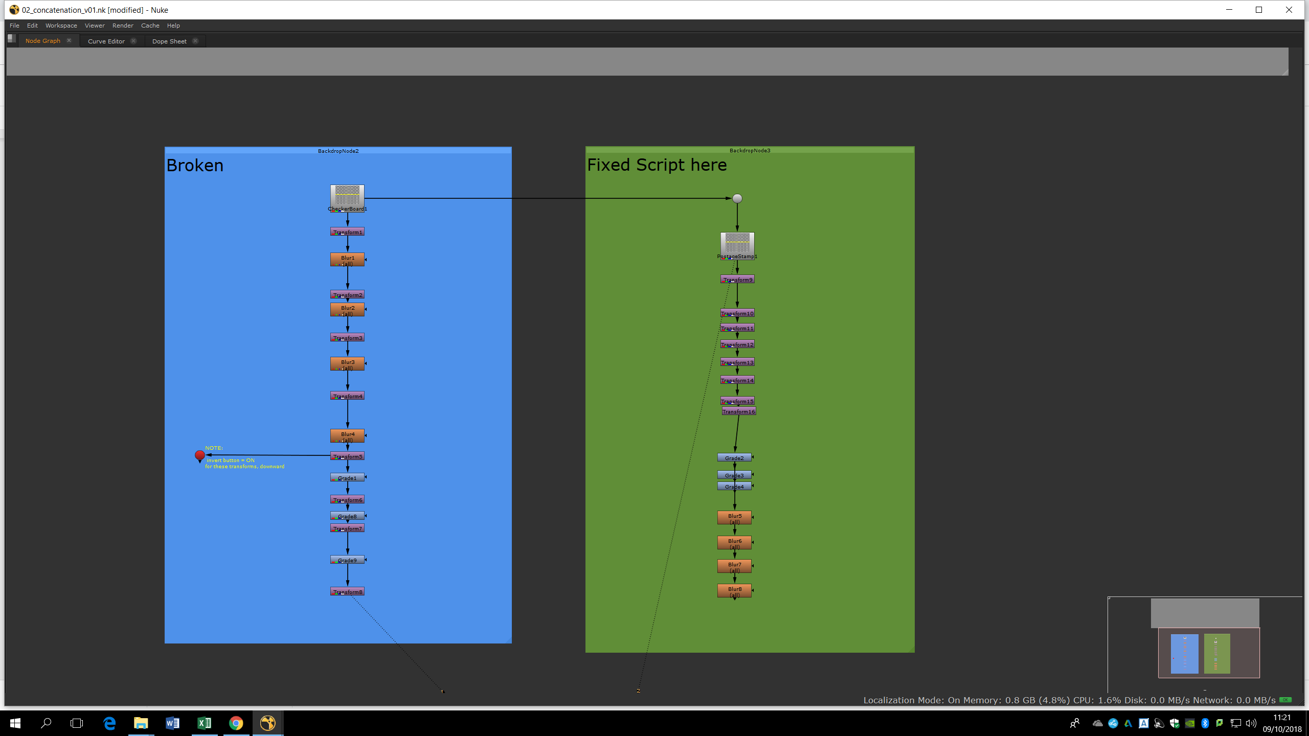 The random concatenation of the notes in Nuke can mean a loss of quality and resolution in the footage we are working with. If we have several notes with the same function, is much better to connect them together rather than mix them and connect them randomly. We can see a huge difference in the quality on the resulting footage after applying the notes as is shown in the picture. The footage keeps almost all it’s quality when the notes are arranged as the scheme of the left.