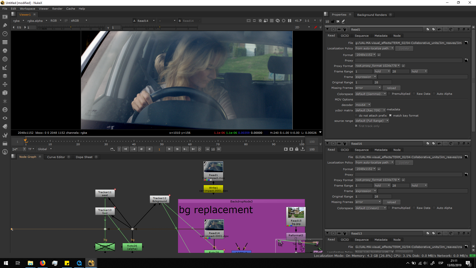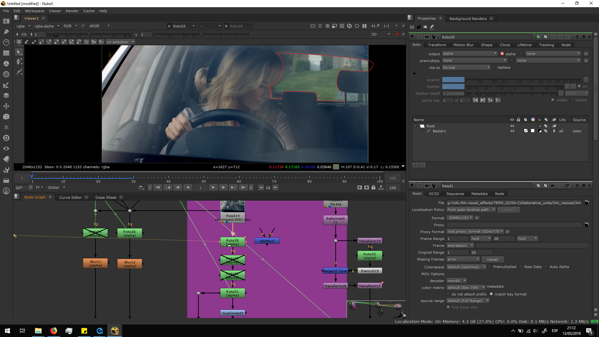 Finally, I did a roto to limitate the edges of the window, so the dist and glasses are always seen as they were inside of the car. I copied the same roto for both FX elements.