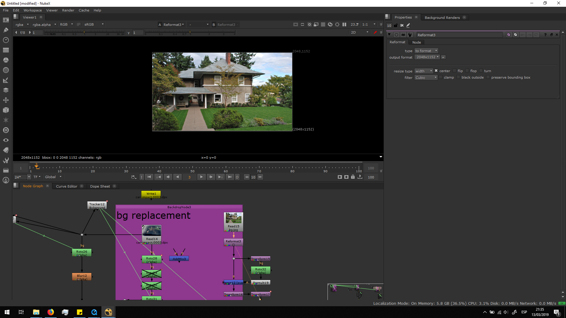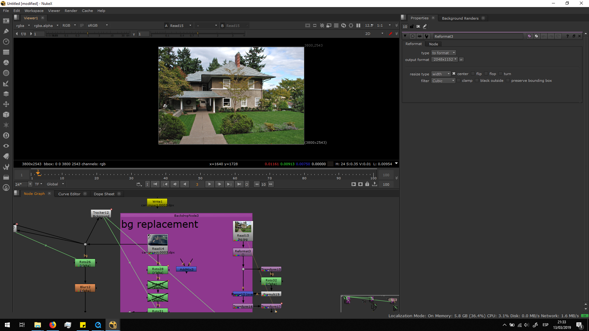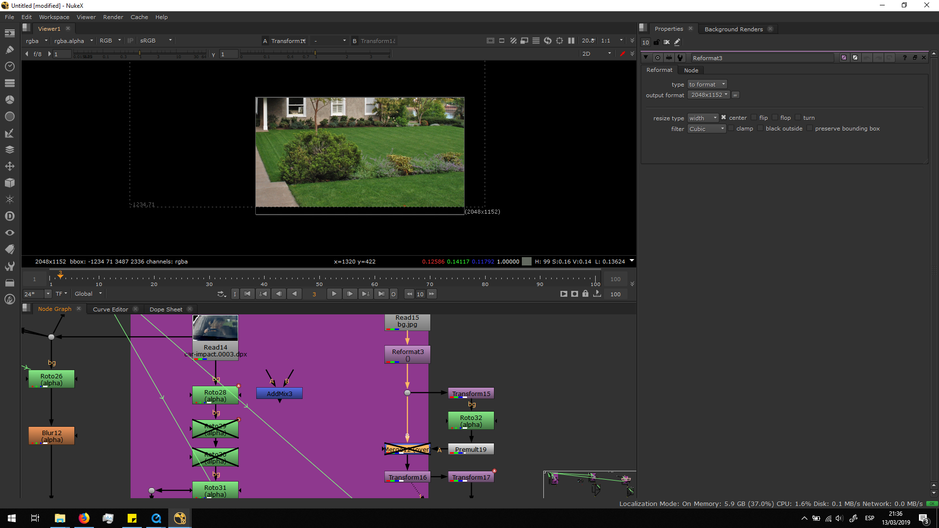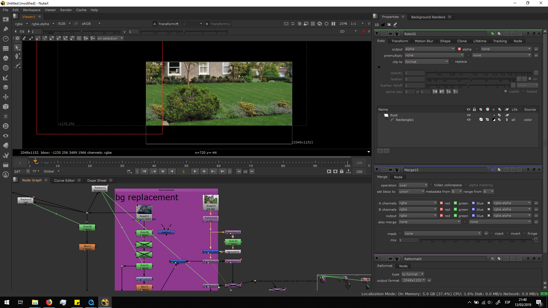 As we can see, it looks a bit awkward in the left corner. Therefore, I added a dot after the reformat note, in order to add a transform note to move the image to the left, do a roto, and merge it over the other background, having this result.