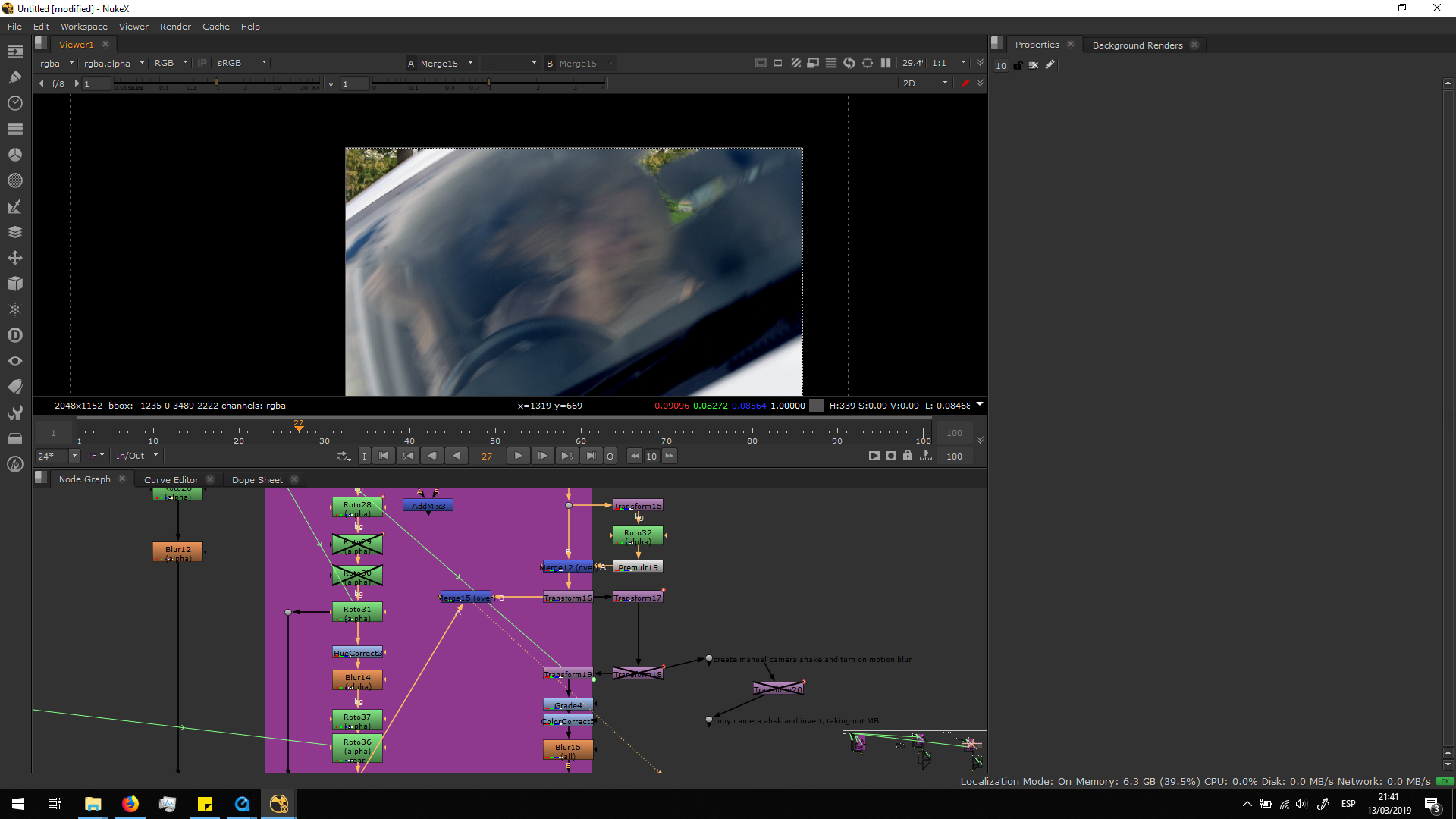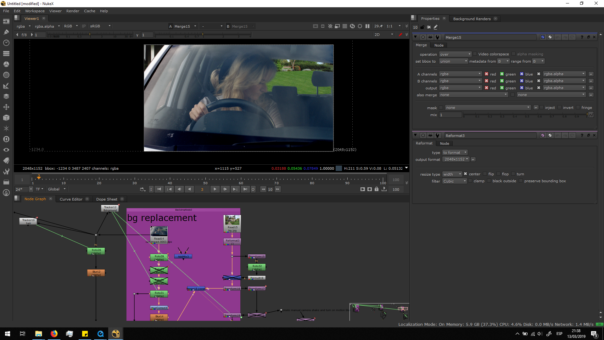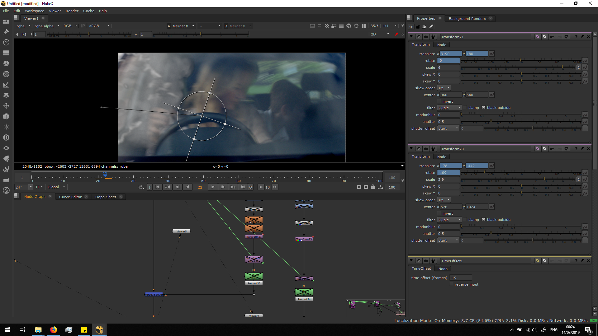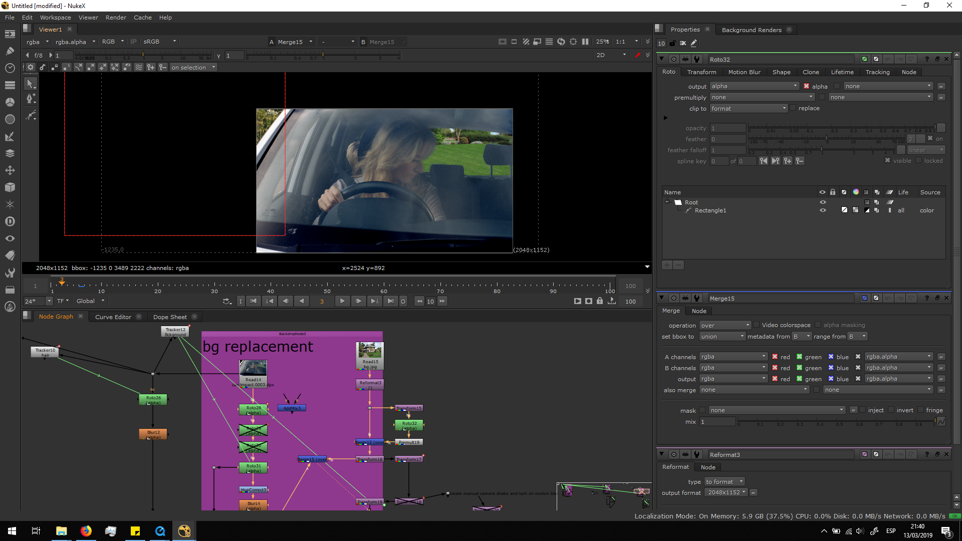 As we can see, it looks a bit awkward in the left corner. Therefore, I added a dot after the reformat note, in order to add a transform note to move the image to the left, do a roto, and merge it over the other background, having this result.