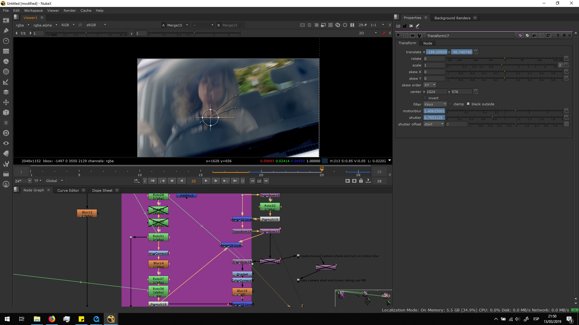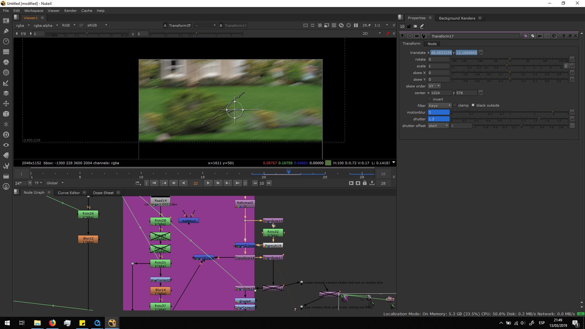 In order to fix that, I added a transform note, and with that I moved the background in the same direction as the direction of the blur of the real footage, in that part in which the camera moves. Then, I add motion blur in the transform note, increasing and decreasing it depending in the blur of the original image.