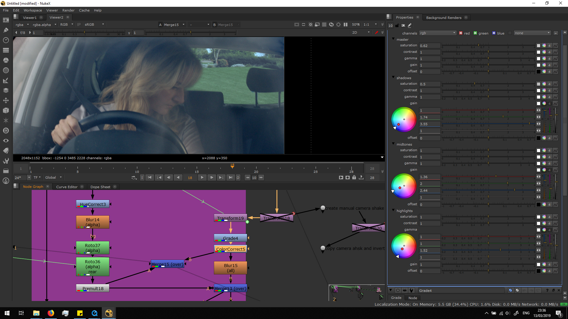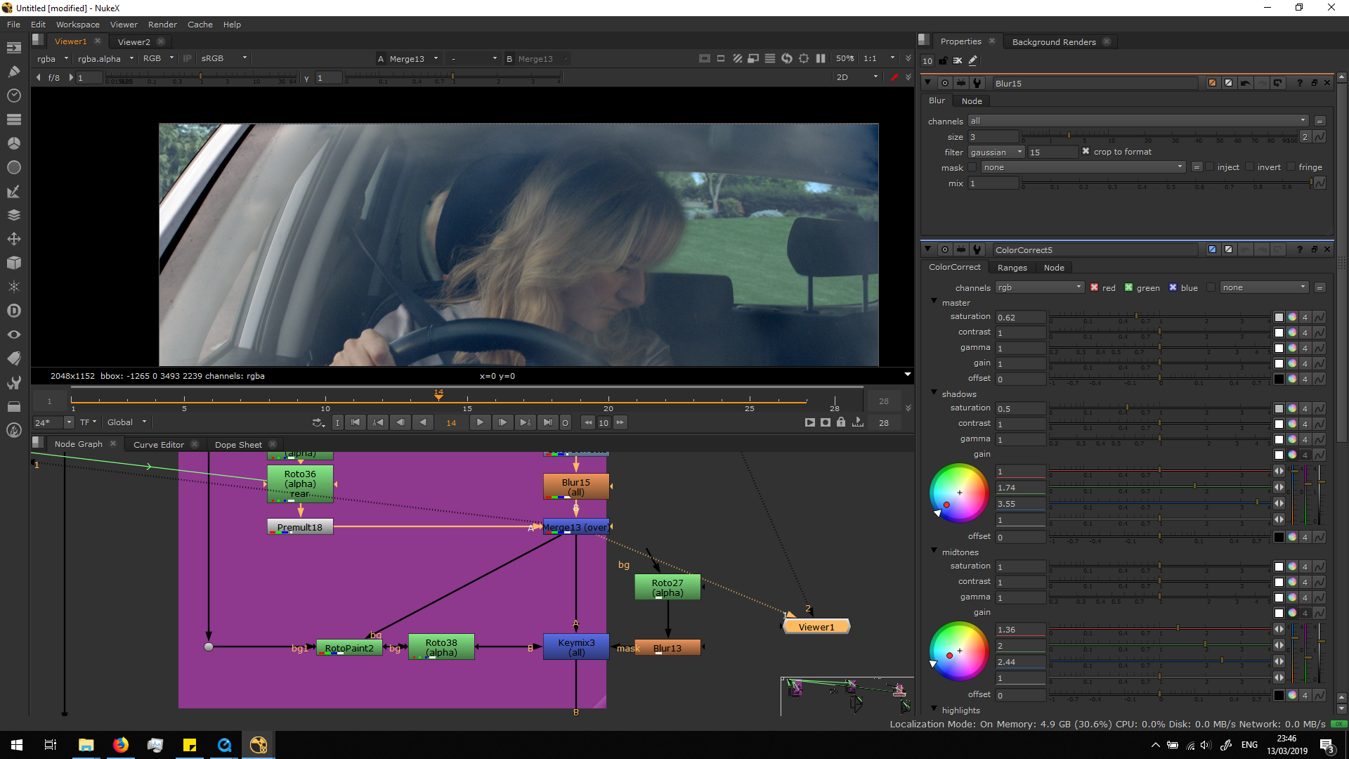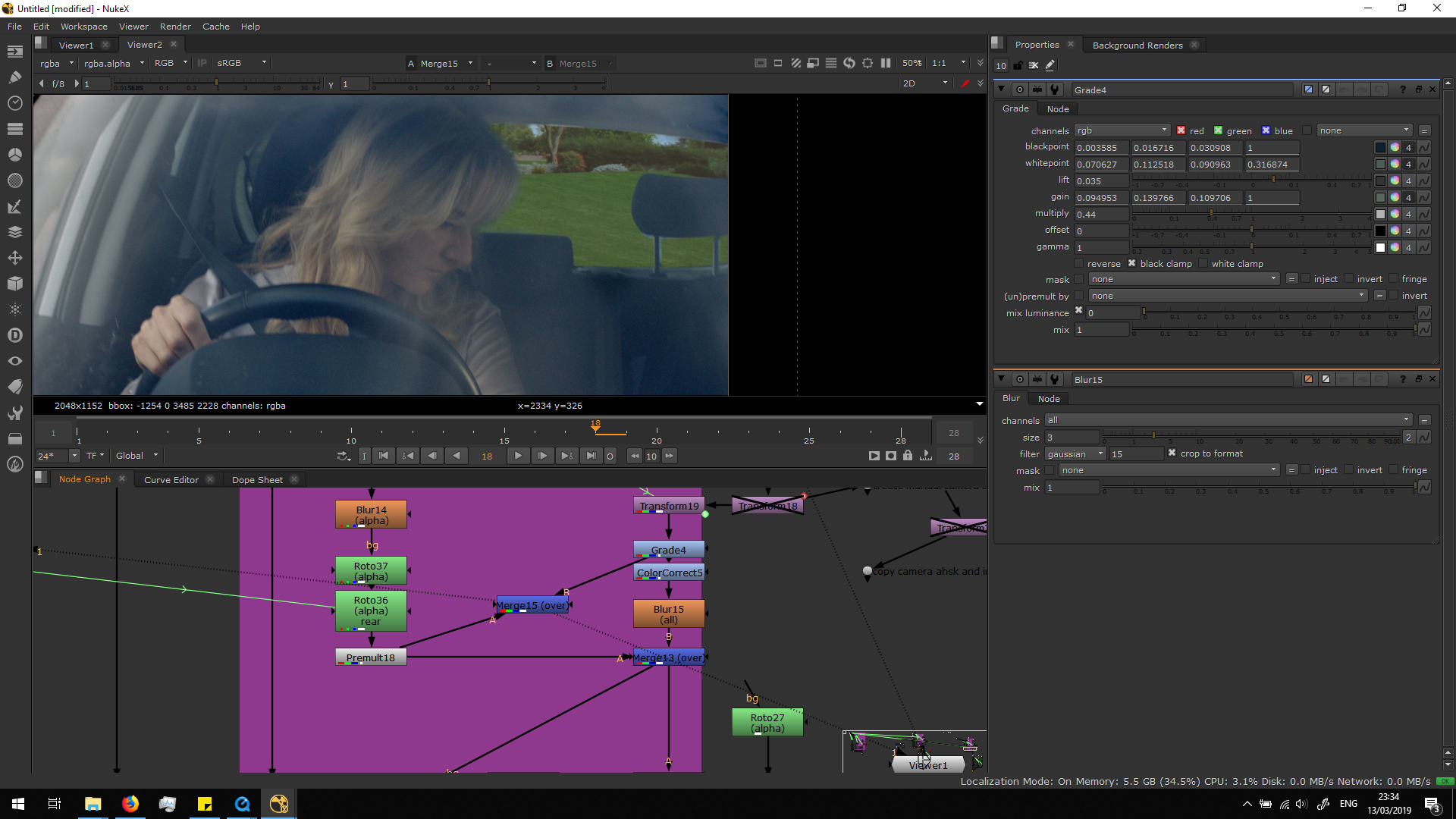 In order to adjust this issues, I did another roto with no blur and high detail for the back of the car. Also, I did the blurry roto for the hair, premultiplying and merging it over the other rotoes. Then, I refined the grade to make the background blend better.
