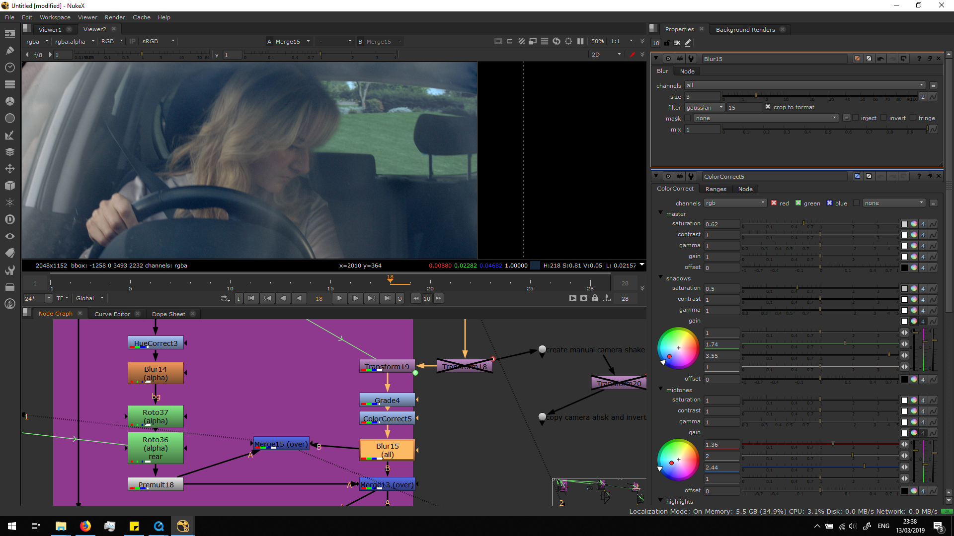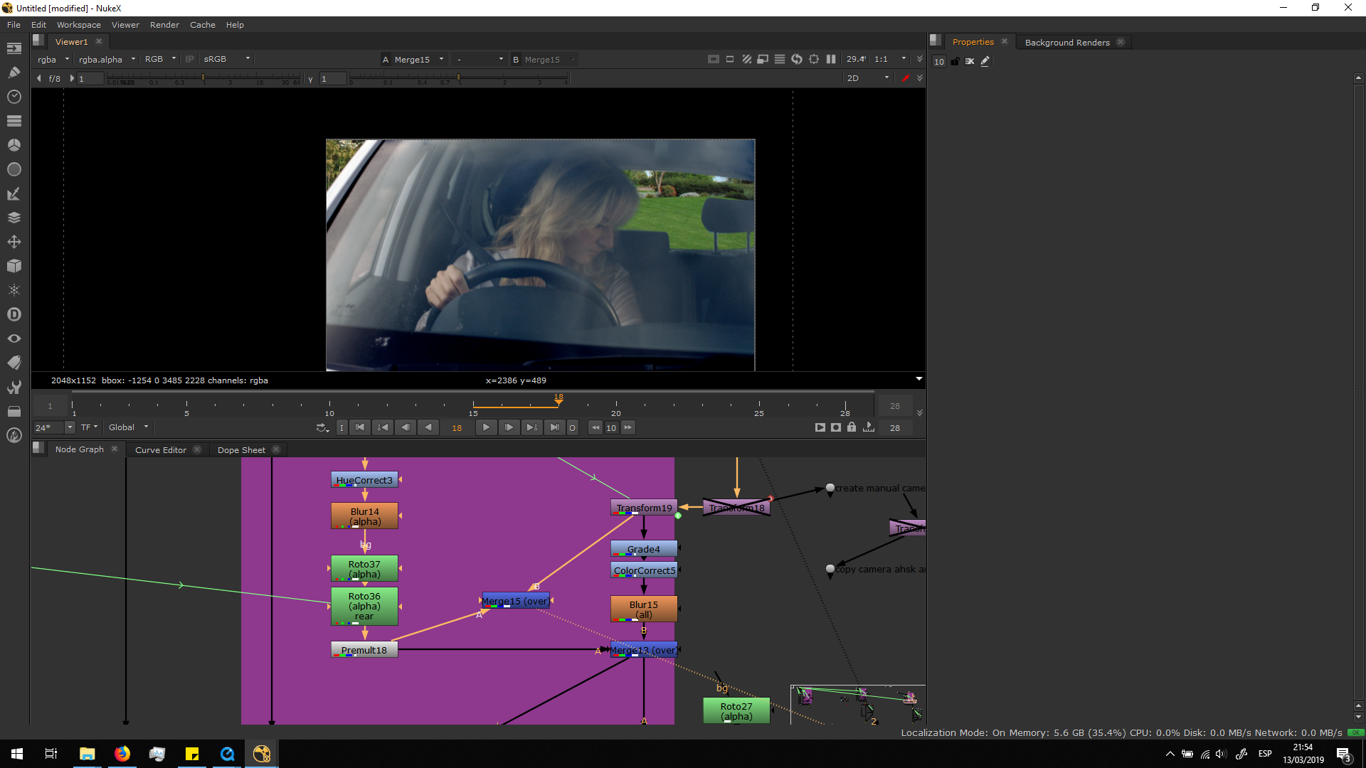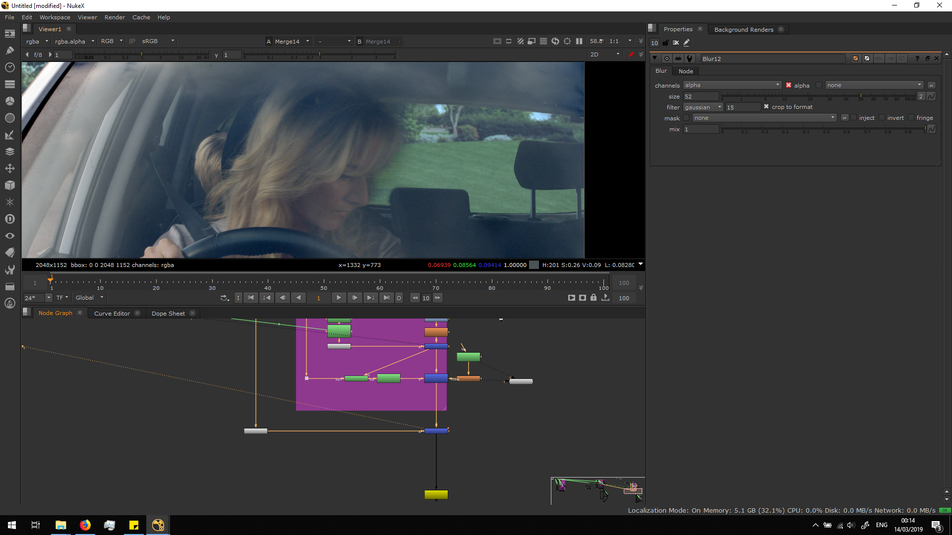 In order to adjust this issues, I did another roto with no blur and high detail for the back of the car. Also, I did the blurry roto for the hair, premultiplying and merging it over the other rotoes. Then, I refined the grade to make the background blend better.