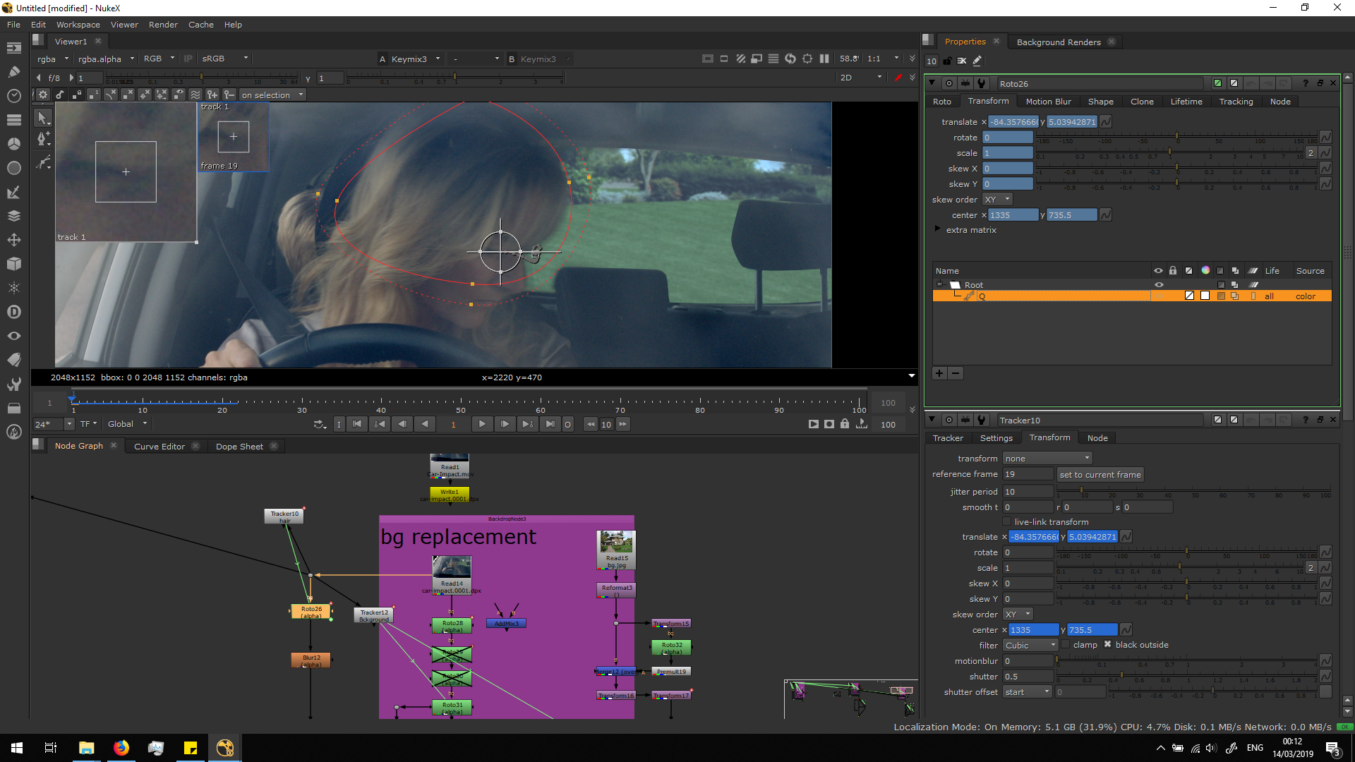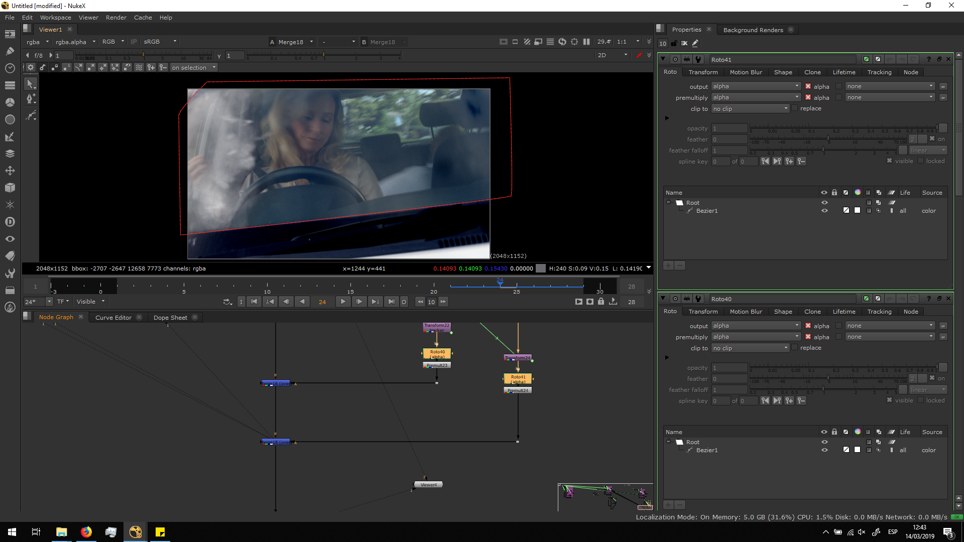 At first, I did the roto painting for the whole car area, but then I saw that it was only working for the hair area, so I masked the rest out. For that, I added a keymix to mix the alpha channel of the roto painting with the one we had before, adding a mask to mask out the area of the car settings from the roto painting, having this final result.
