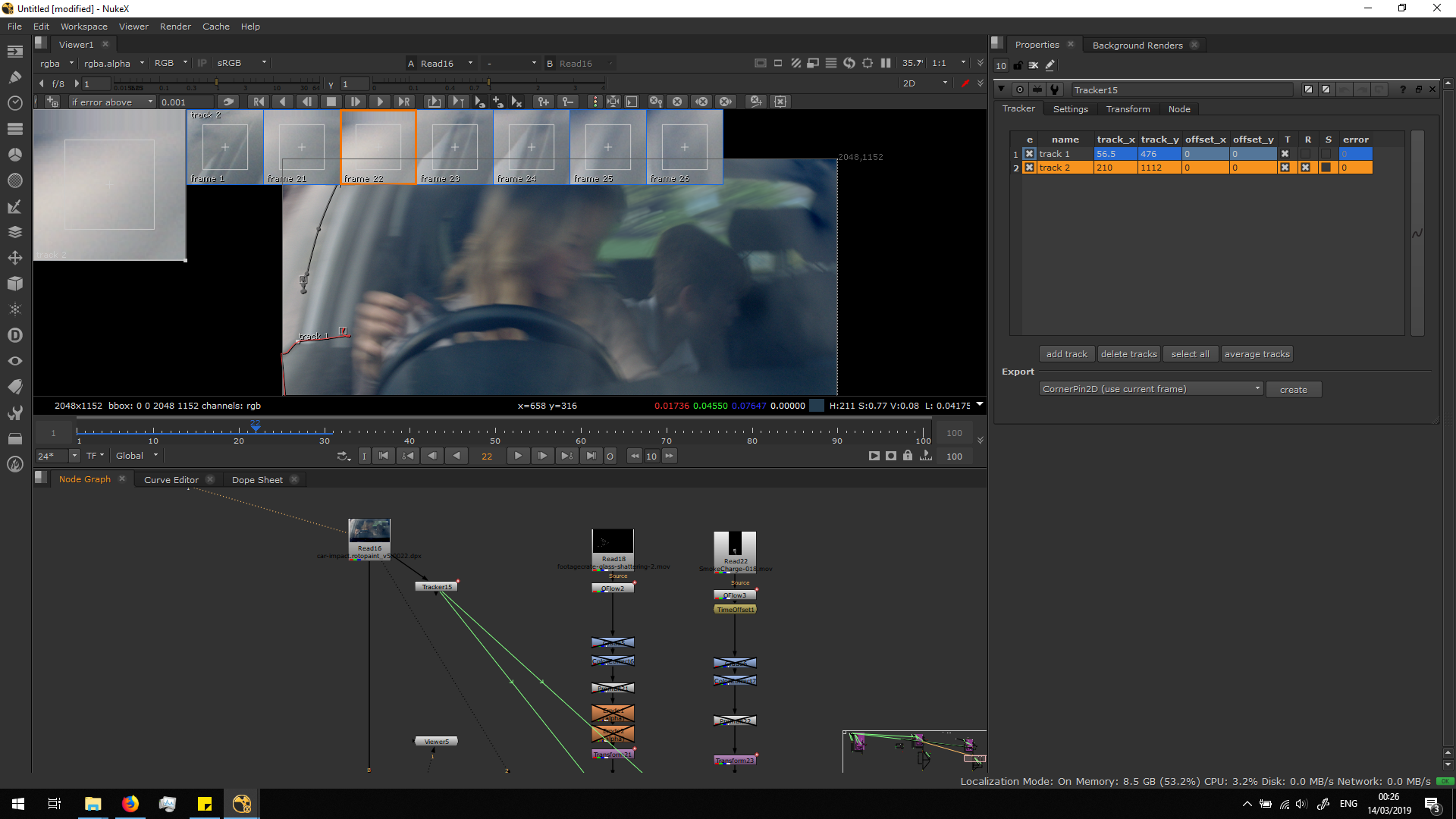 Also, the camera had some movement at the beginning of the footage, since it is recorded with hand camera and not a tripod. In order to add that little shake in the background, I did a tracker in the background of the real footage. I decided to do the tracker in the background and not in the car because they might not move at the same speed and distance because of the parallax effect.