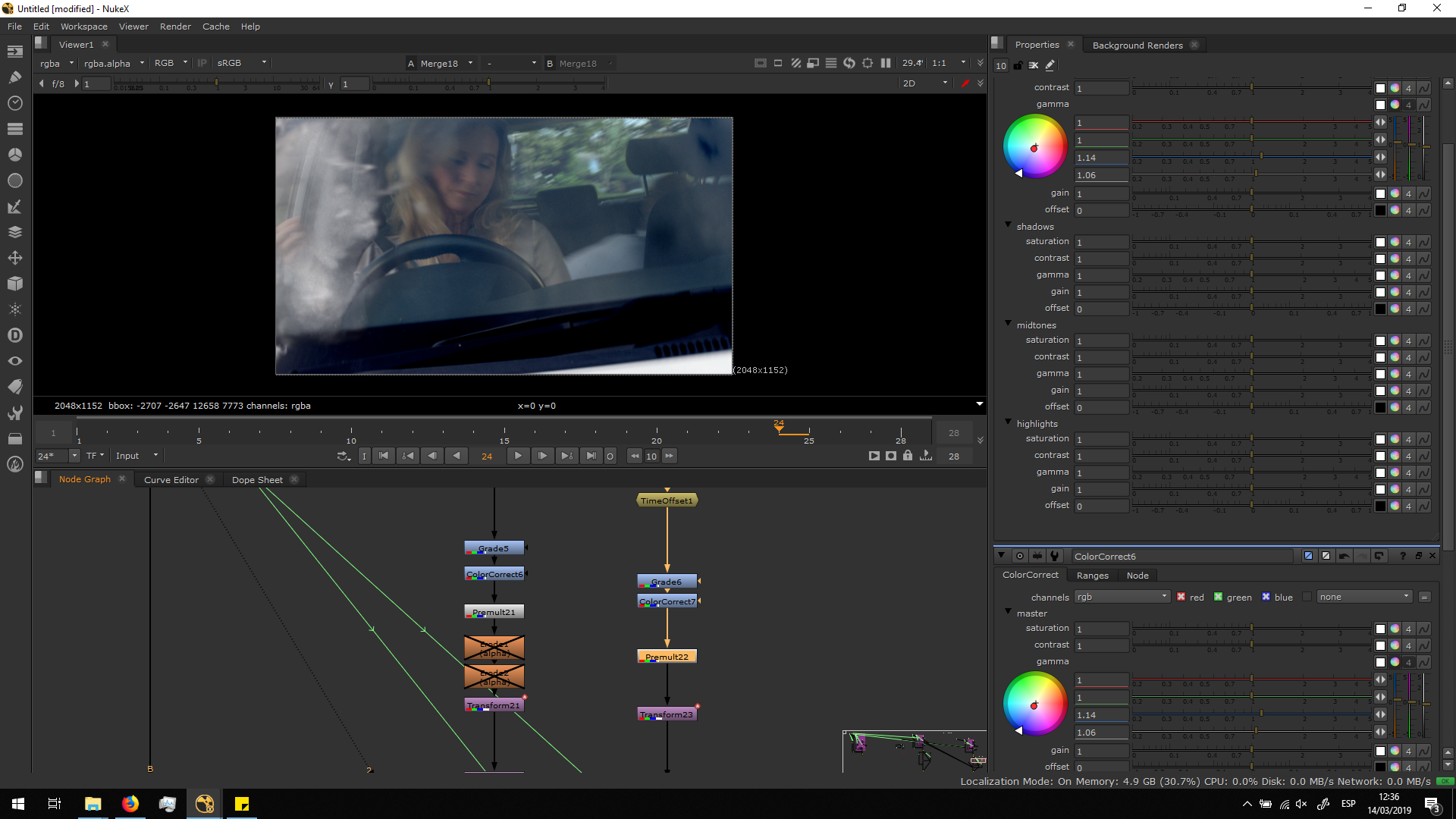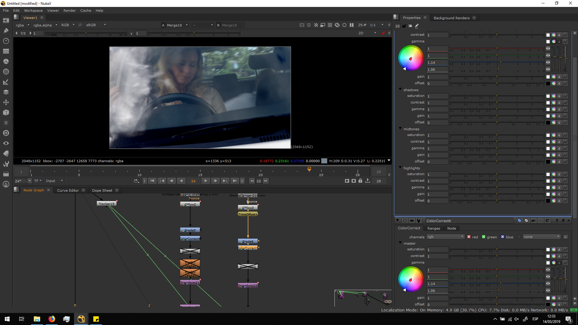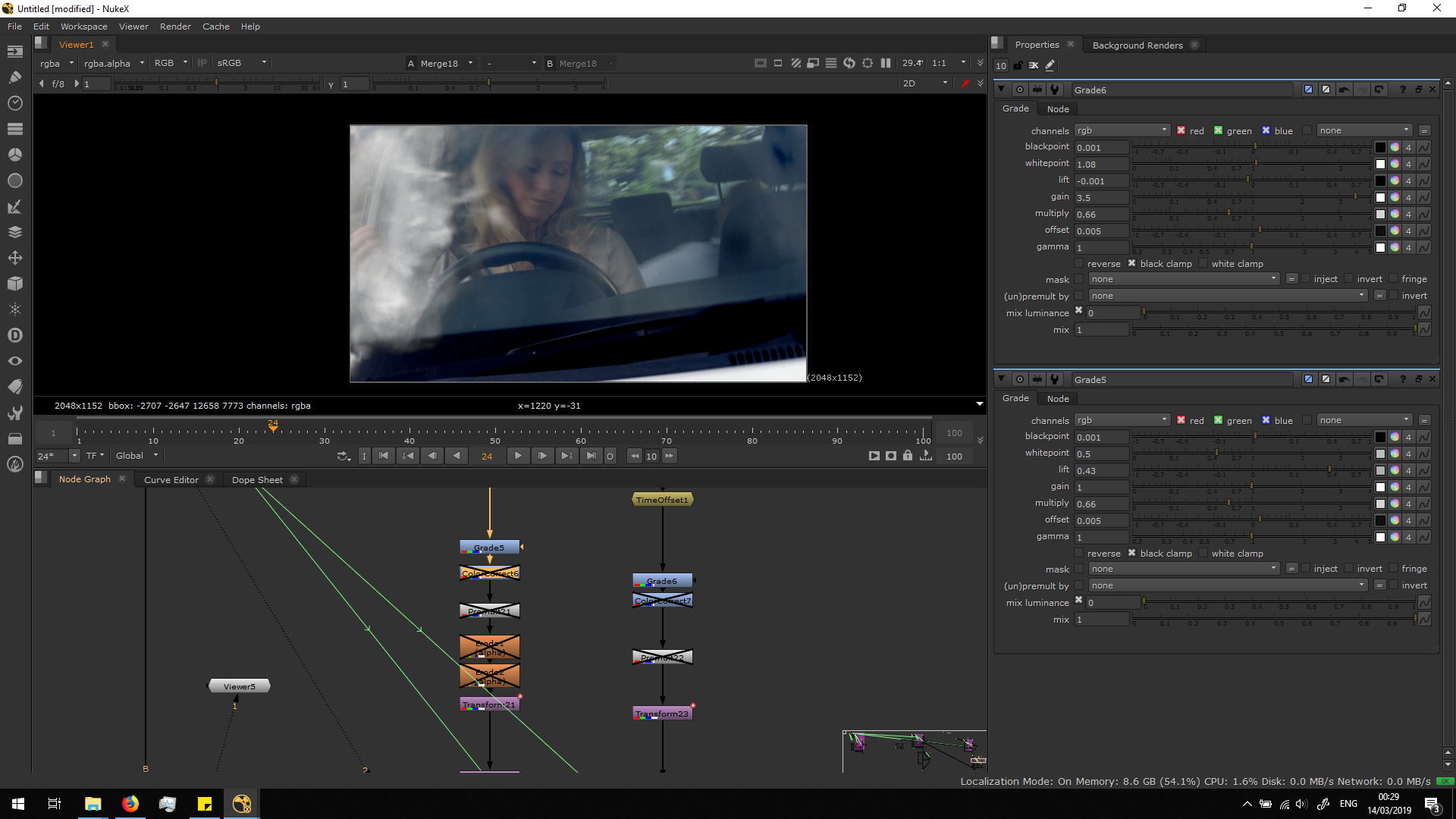 But, as we can see, there is a huge difference of tone between the new background and the footage. We will need to adjust this by grading the image according to the footage. Therefore, I added a grade note to the background, sampling the blackpoint in the darkest part of the footage and the brighter part of the footage for the gain and the whitepoint. Finally I shifted the lift to make it darker. We can always play with this parameters, sampling different pixels in order to make it reach the aspect that we want.